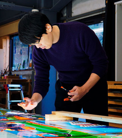 1973年、福岡生まれ。九州芸術工科大学卒。福岡でのストリートアート活動を経て、2002年、神奈川県に拠点を移し本格的に創作を開始。最近の主な仕事に、東京メトロ銀座線パブリックアート、トヨタ自動車カレンダー、みずほフィナンシャルグループ広告ビジュアル、映画「流浪の月」美術協力、Hey! Say! JUMP「春玄鳥」MV美術セットアートワークなど。2015年、アートフェア「UNKNOWN ASIA」にて「イープラス賞」受賞。