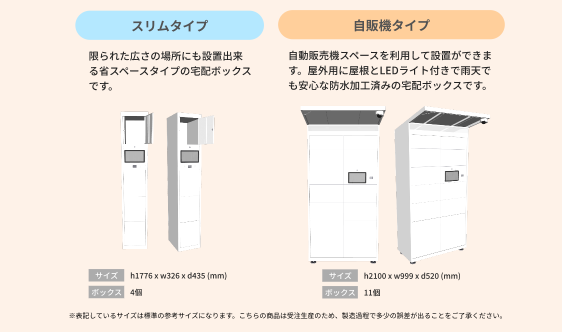 スペースが限られた物件でも導入できるよう、通常サイズのスタンダードタイプの他に細身のスリムタイプや背の低いミニタイプ、自動販売機のスペースに設置できる自販機タイプも展開しています。設置スペースに合わせたオリジナルサイズの制作も承ります。
