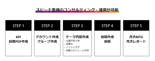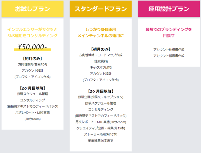 本サービスは、Instagramの運用をアカウントの方向性戦略から立案し、記事の投稿企画やスケジュール管理、月次でのデータ分析までサポートします。月5万円から手軽に始められますが、戦略に応じたインフルエンサーをアサインするなど、お客さまのめざすSNS運用に合わせたコンサルティングが可能です。また、SNS運用のノウハウを持ったデザイナーが丁寧にヒアリングをした上で運用開始するため、最短3日で投稿をスタートできます。