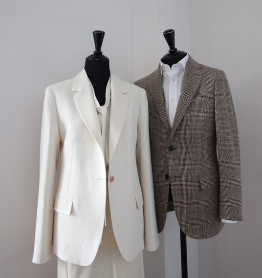 メンズジャケットは、職人技光る「総毛芯仕立て」で立体的に縫製することで、軽やかな着用感を実現。レディースジャケットも同様に軽やかな着用感を追求しながら、生地の持ち味を生かしたドレープ感やラペルのロールの美しさにこだわることでエレガントに仕上げました。