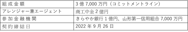 本シンジケートローンは、商工中金様がアレンジャーを務め、きらやか銀行、山形第一信用組合が参加し、地域金融機関との協調により、その組成が実現しました。