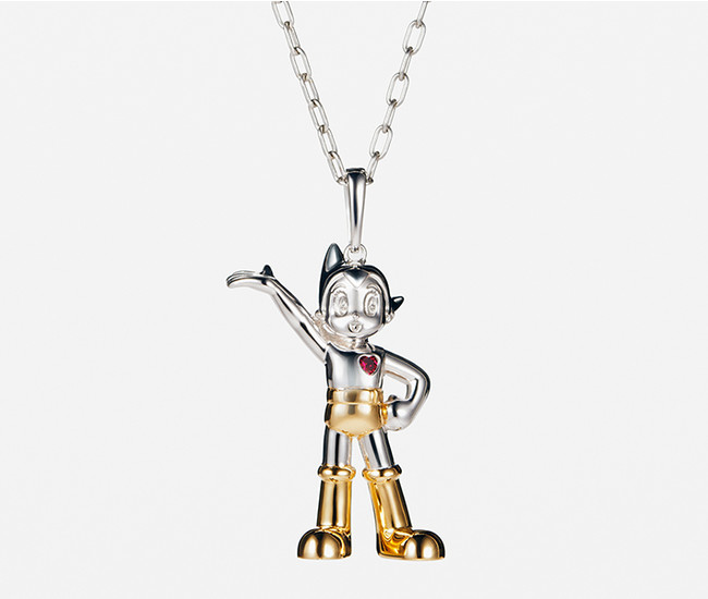 今回のコレクションでは、BAITによるオールブラックの「鉄腕アトム」キャラクターフィギュアと、デイリーに身につけられるネックレスが登場します。どちらも彼の象徴的なポーズをもとに、胸に彫られたハートのディテールを強調することで、彼の人間性を象徴しています。