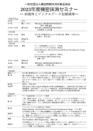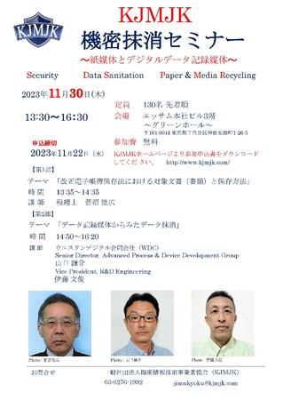 こうした動向を踏まえて、「紙媒体とデジタルデータ記録媒体」をサブテーマに11月30日に3名の講師を招聘し機密抹消セミナーを開催します。参加費は無料です。