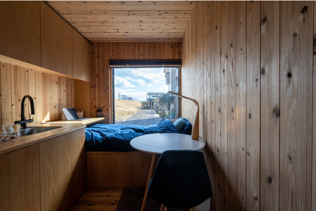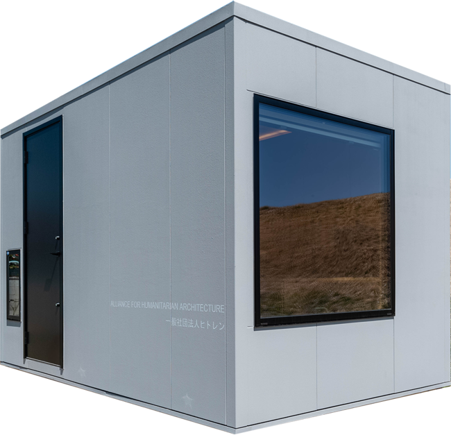そこでヒトレンでは、縦ログ構法で建てた Capsule Box の活用を提案いたします。平時に於いては一時宿泊施設や、個人オフィス、店舗などとして全国に展開、確保しておき、避難者だけでなく、災害支援で長期滞在する支援者の宿泊施設としても活用できます。床面積を 10 平方メートル 以下に抑え、道路運送車両法内に収まる寸法で、シャシーに乗せればトレーラーハウスとして移動できます。体育館に雑魚寝するのではなく、長期避難時の生活空間から仮設住宅期、恒久住宅まで快適で安心して使える住宅ユニットが災害時に瞬時に提供されるような未来を目指しています!