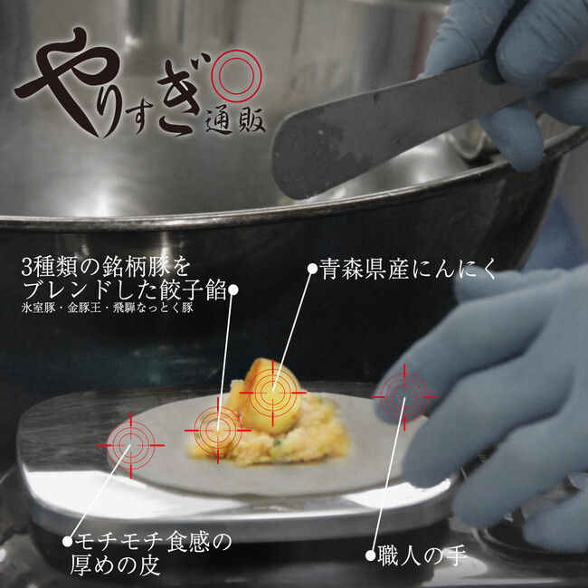 やりすぎ餃子「超にん肉餃子」”は「やりすぎ通販」の第一弾商品として開発された商品で、まるごとの青森県産にんにく1片と、東京・西麻布の豚料理の名店『豚組』が約1年半かけて取り組み、厳選した3種の銘柄豚をブレンドした餃子餡を詰め込んだ、一度は食べていただきたい“やりすぎた”餃子です。