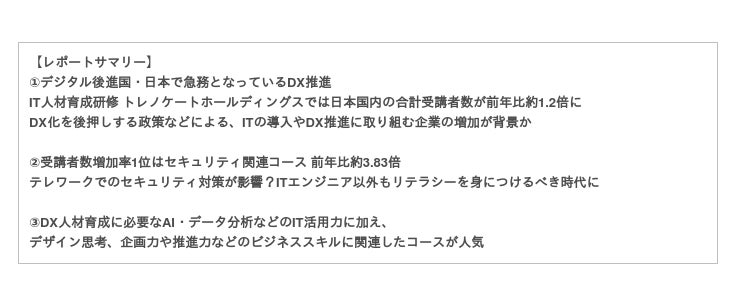 セキュリティ関連コースが受講者数前年比約3.8倍で伸び率1位に DX人材育成に必要なAI・データ分析や開発系のコース、ビジネススキルコースも伸長