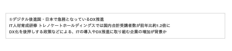 日本は、自社でコントロールできる改革である「守りのIT」を重視し、ステークホルダーを巻き込んで改革する「攻めのIT」ができていないと言われています。当社では、「攻めのIT」に不可欠なAI・データ分析関連コース、 Java、プログラミングなどの開発系コースにおいても、受講者数の増加率が大きく、 AI・データ分析関連コースは前年比約1.6倍、開発系コースは前年比約1.3倍となりました。