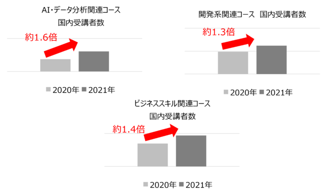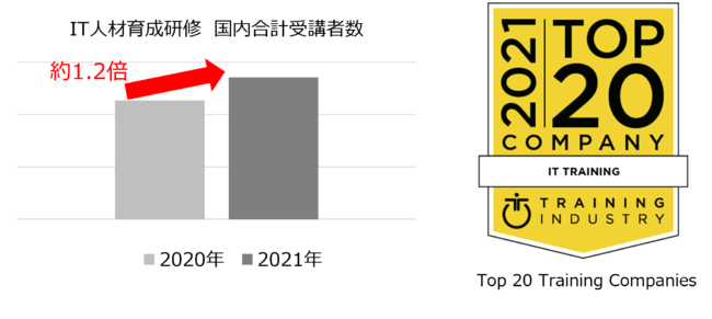 昨年2021年は、コロナ禍でのテレワークの導入によるIT化も余儀なくされる中、デジタル庁発足、DX投資促進税制の導入など国としても各企業のDX化を積極的に後押しした年でした。当社が提供する研修サービスにおいては、2021年の国内受講者数合計が前年比約1.2倍と多くの方に受講いただき、各企業においてIT人材の需要が高まっていると分かります。