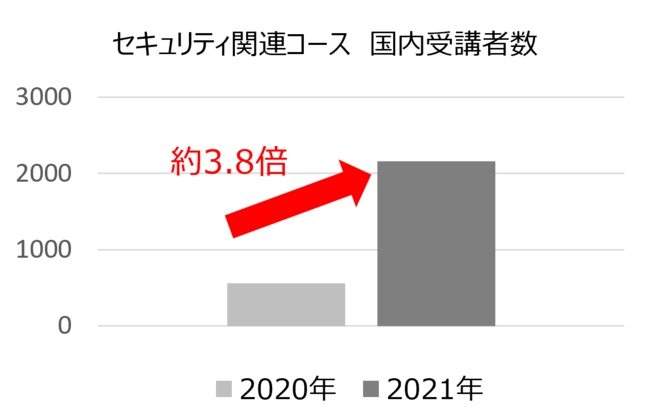 当社が提供しているコースの中で、2021年最も受講者数の増加率が高かったのはセキュリティ関連コースで、前年比3.8倍となりました。新型コロナウイルスの流行によるテレワークで、セキュリティシステムの導入や、ITエンジニア以外も含めた全社員のリテラシー向上に急ぐ企業が増えていると推察されます。