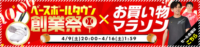 それを記念して4/9(土)20:00~4/16(土)1:59まで開催される楽天お買い物マラソンの期間中、「ベースボールタウン創業祭」と題したセールを開催中です。