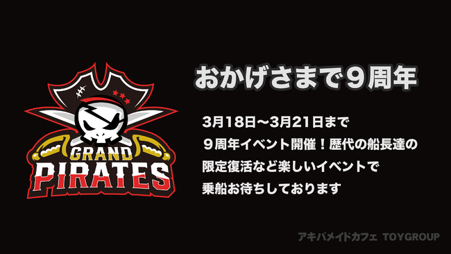 3月18日~3月21日まで、グレランドパイレーツでは、9周年イベントを行います。歴代の船長の復活など楽しいイベント盛りだくさんで、お待ちしております。