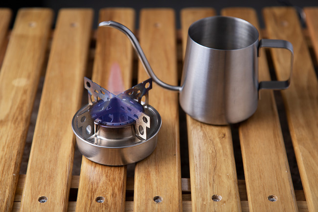 ミニマムサイズの五徳付きアルコールストーブ、手のひらサイズのドリップポットがセットになって、どこでもお湯を沸かしてドリップ可能になりました。ドリップポットは細く少しずつ注げるため、ドリップを自在に操れ安定した味を実現します。ステンレス製で錆びにくく、お手入れも簡単です。