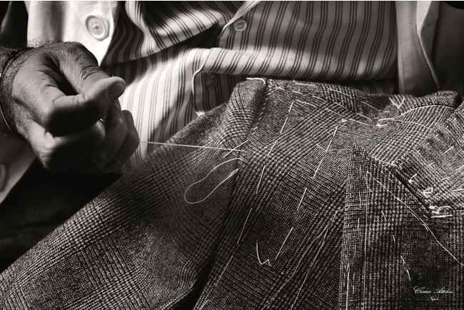 しなやかで洒脱なディテールを持つ「ナポリ仕立て」を創案したチェーザレ アットリーニのスーツは、生地の厳選からアイロン仕上げに至る多くの工程が卓越した職人の手仕事により作られ、世界最高峰とも称されています。