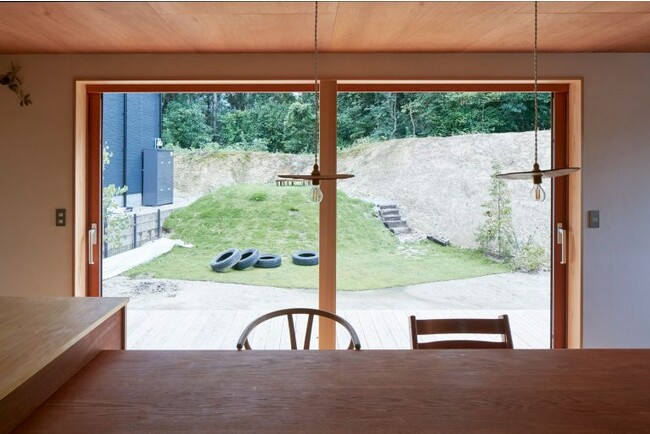 外壁材として日本の伝統工法で作られた「焼杉」と大きな木の窓を用いたナチュラルでありながら、素朴さが感じられるお家です。