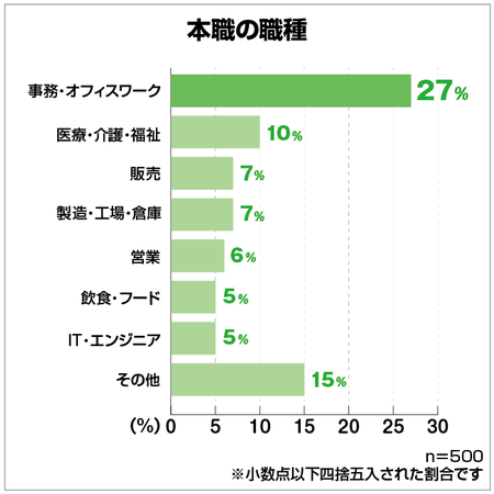 職種は事務・オフィスワークが最も多く、3割ほど。他には次の職種が4%以下で僅差でした。