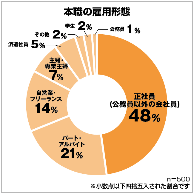 副業ではなく、本職の雇用形態は正社員(公務員以外の会社員)が約半数で最多、次いでパート・アルバイト、自営業・フリーランスなど。
