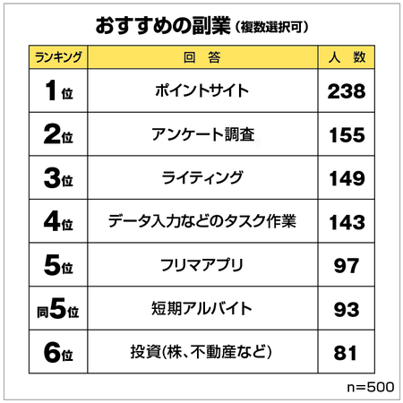 副業経験者の男女500人が選ぶ、やってよかったおすすめ副業ランキング上位6位まではこちら。ポイントサイトやクラウドソーシングに登録して依頼を受けるライティングやデータ入力などのタスク作業はやはり人気でした。