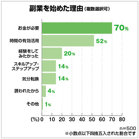 お金が必要になって副業を始める人や、スキマ時間など時間の有効活用のために副業を選択したという方が多いようです。