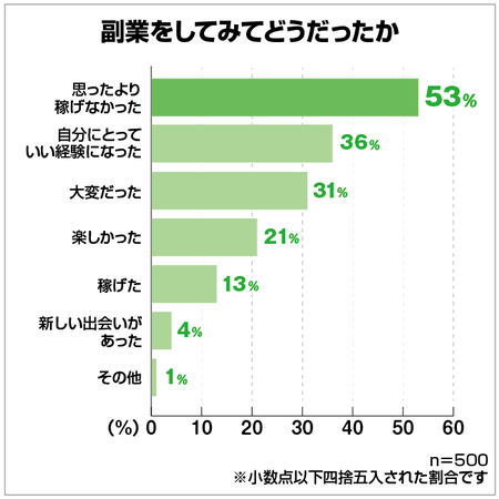 副業経験者の500人の約半数は、「思ったより稼げなかった」というちょっと残念な感想。しかし、「自分にとっていい経験となった」「楽しかった」という意見も多く、副業はお金を稼ぐことの大変さがあるが、実りになるということがわかる回答結果となりました。