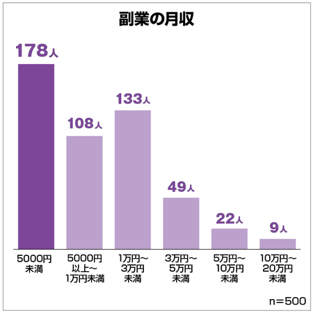 副業のみの月単位の収入は3万円未満の方が大部分で、最も多い回答は5,000円未満でした。