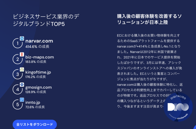 Narvar, Inc. (本社:アメリカ合衆国カリフォルニア、CEO: Amit Sharma、以下「Narvar」)は、1月25日午前9時(米国東部時間)にSimilarweb社が毎年発表するDigital100に選出されました。今回、Narvarは2022年日本で最も急成長したデジタルブランド・ビジネスサービス部門で第1位を受賞しました。