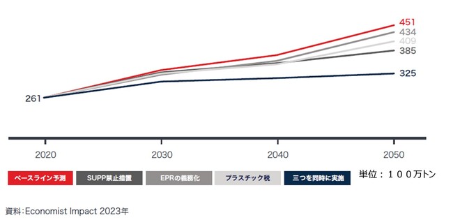 本報告書では、3つの政策を組み合わせて実施した場合、プラスチックの消費量は、2019年と比較して2050年には1.25倍の3億2500万トンに抑制はできるが、“ピーク・プラスチック”の実現は難しいとしており、今世紀半ばまでにプラスチック消費量を下降局面へ移行するには、今回検証した3つの政策よりも大胆な取り組みが求められると結論づけています。