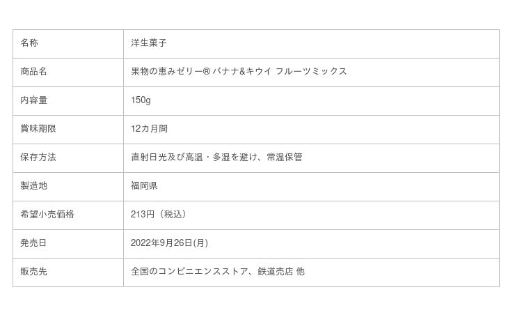 「果物の恵みゼリー(R)」は、2021年3月にパイナップル味を発売し、同年10月より果肉入りにリニューアルしたパウチゼリーです。今回、1年ぶりに登場する新味は、ドールが誇るバナナにゴールドキウイを組み合わせたフルーツミックス味です。いつでもどこでも、すぐに食べられるパウチタイプでありながら、フルーツならではの栄養と、腹持ちのよい満足感を兼ね備えており 、忙しい日の朝ごはんや隙間時間の間食にもぴったりです。
