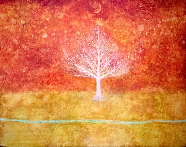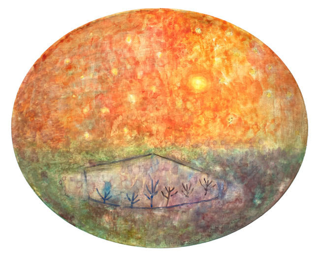 久保の伸びやかな感性による絵画のモチーフは、東京郊外の自然の多い自宅付近の散歩道、風、雨、木、鳥、星の音、声、光を感じ、インスピレーションを得て生まれる想像の風景です。そして、その曖昧な風景は多くの人の郷愁を誘う心象風景のようにも思えます。
