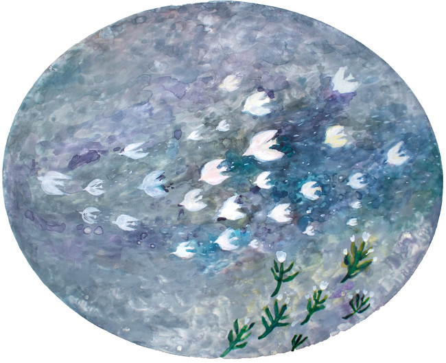 久保晶《飛ぶ鳥》、2022年、キャンバスに水彩、45x53cm