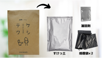携帯トイレ「ケシテク」とは、弊社が開発した自然治癒力にこだわった技法から精製された天然物のみの消臭材「すけっ土」と凝固剤と排便用の処理袋をセットにした携帯トイレです。