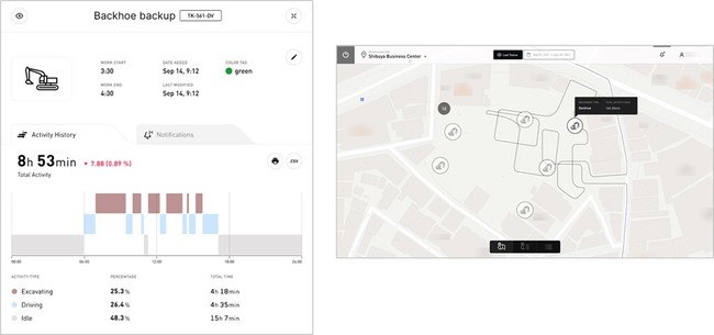取得した作業内容や稼働時間、位置情報などのデータは、「ランドログプラットフォーム※3」を通じて確認いただけます。今回新たに開発した本サービス専用の「Landlog Viewer」は、これらのデータを地図やグラフなどを活用して表示するため、初めての方でも容易にお使いいただけます。