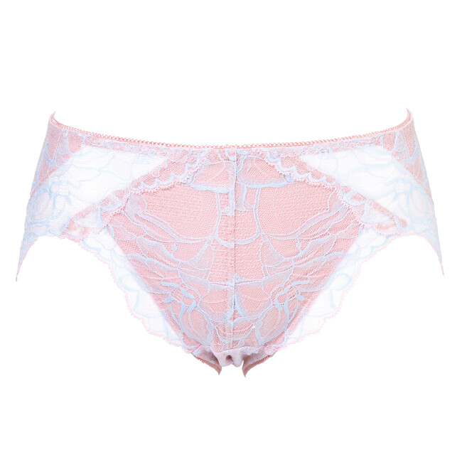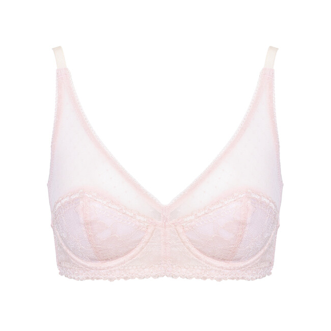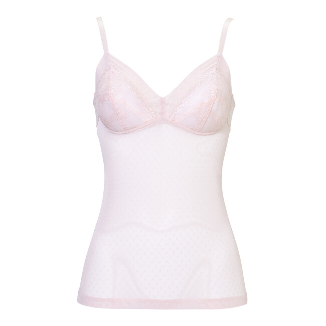 ブラ、カップ付きキャミソールの裏カップ素材(不織布ラミネート)のみを全色アイボリーにし、レースの透け感を際立たせたことでドット柄のパワーネット(上カップ)の透け感と合わせて、より軽やかな雰囲気を出します。