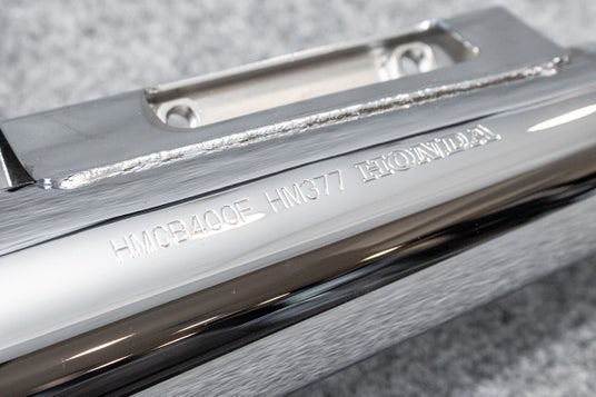 当時と同じ規格でクロームメッキ加工を実施マフラーのクロームメッキは自社で行われ、厚みや品質も当時のホンダ純正と同等。厚いメッキや中古マフラーの再メッキ品では刻印の角が甘くなり、文字がしゃきっと見えないケースも多々ありますが、マフラーの刻印も実にはっきりとしています。