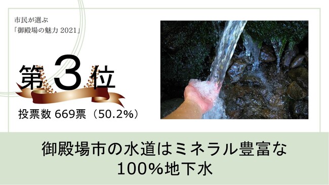 2021年12月に当市が行った市民・市外在住者による投票企画「御殿場の魅力ベスト10(市民編)」では、1位の富士山、2位の御殿場プレミアム・アウトレットに次いで、なんと「御殿場の水」が全50項目の中から3位にランクインしました。