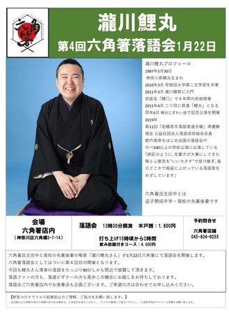 株式会社開物成務(本社:神奈川県横浜市 代表者:田中朋行)が運営する居酒屋「六角箸」(横浜市神奈川区六角橋3-7-14)を会場に定期開催を行っている「六角箸落語会」の第4回が、2023年1月22日(13時30分開演)にて開催することが決定しましたのでお知らせです。
