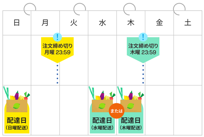 7月24日(日)配達週より、水曜・木曜日配達のお客様のご注文締め切りが配達前週の木曜日23時59分に変更になります。これまではお選びいただいた配達曜日に関わらず、配達前週の月曜日の23時59分が注文締め切りとなっており、水曜・木曜日配達のお客様にはご注文の確定から配達まで通常より長い時間をいただいておりましたが、今後は注文確定からより短い時間でミールキットをお届けすることが可能になります。