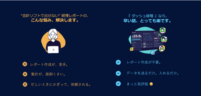こららの人々に対峙している経理担当者の業務を軽減するため、定型のレポート内容をダッシュボード化し、いつでも確認できるようにすることで、レポート作成依頼をなくしてしまうサービスです。