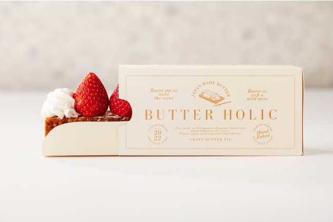 「クラフトバター専門店」ならではのパイの食感とバターの風味を感じていただくため、 パイ厚みやキャラメリゼの強さを調節し、ほんのりと塩味をプラスしました。 また、パイだけではなく、クリームにもバターを感じていただくため、しつこくない濃厚バターカスタードを開発しました。 今までにない「片手で食べられるワンハンドミルフィーユ」をお届けするため、 みなさんに喜んでいただけるだけのボリューム感を損なわないよう配慮しながらも クリームがこぼれやすい等の課題を解決して参りました。 ただおいしい・かわいいだけじゃない、 忘れることのできない「記憶に残る」BUTTER HOLICバターパイを ぜひお召し上がりください。