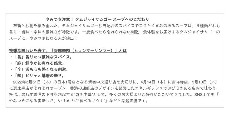 (※3)2022年3月10日時点の店舗数、「タムジャイグループでは、『譚仔雲南米線』を合わせ香港、中国本土、シンガポールで172店舗を展開(2月末時点)」