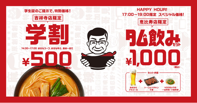 このたび、タムジャイサムゴーファンの皆様にも、まだタムジャイサムゴーを味わったことのない方にも新感覚米線を味わってほしいという想いから、吉祥寺店、恵比寿店にてキャンペーンを実施いたします。吉祥寺店では、学生の方を対象にワンコインで楽しめる「学割」キャンペーンを、恵比寿店では、お酒とサイドメニューがお得に楽しめるハッピーアワー「タム飲み」キャンペーンを開始いたします。