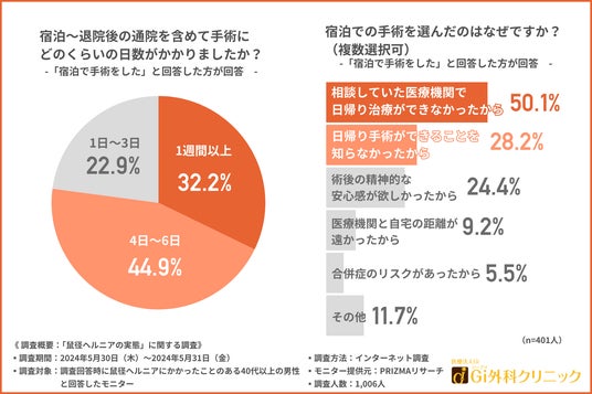 「宿泊での手術を選んだのはなぜですか?(複数選択可)」と質問したところ、約半数が『相談していた医療機関で日帰り治療ができなかったから(50.1%)』、約3割が『日帰り手術ができることを知らなかったから(28.2%)』と回答しました。