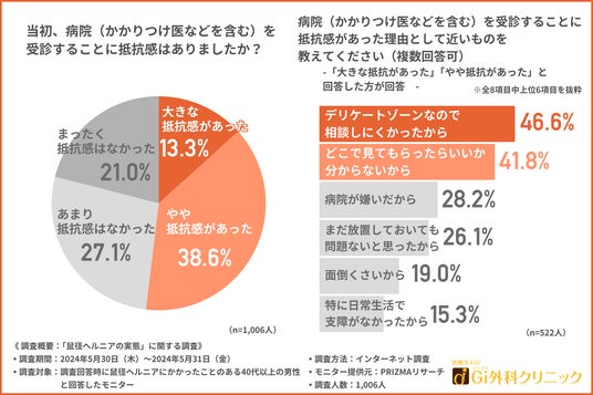 「当初、病院(かかりつけ医などを含む)を受診することに抵抗感はありましたか?」と質問したところ、『大きな抵抗感があった(13.3%)』『やや抵抗感があった(38.6%)』『あまり抵抗感はなかった(27.1%)』『まったく抵抗感はなかった(21.0%)』と続きました。