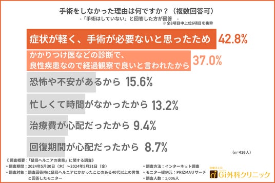 続いて、鼠径ヘルニアの治療に手術を選択しなかった方に対して、「手術をしなかった理由は何ですか?(複数回答可)」と質問したところ、『症状が軽く、手術が必要ないと思ったため(42.8%)』と回答した方が最も多く、次いで『かかりつけ医などの診断で、良性疾患なので経過観察で良いと言われたから(37.0%)』と続きました。