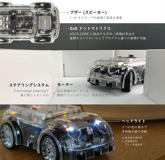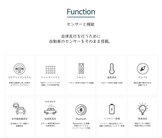 ◎ 音楽の演奏、温度・赤外線・加速度・照度の測定機能、カメラ搭載機種、他にも様々な機能を搭載しており、自分でカスタマイズしながら様々なプログラミングを楽しみながら学べます。