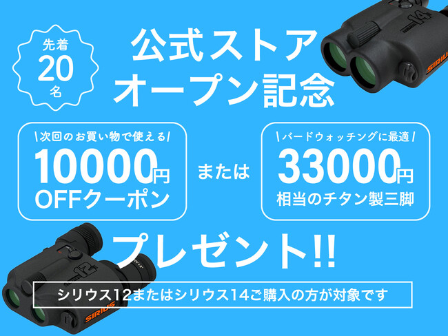 先着20名様限定で次回のお買い物で使える10,000円分のクーポンまたはバードウォッチングに最適な33,000円相当のチタン製三脚をお付けします。