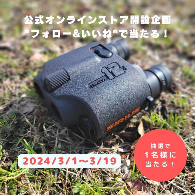 シリウスのインスタグラムアカウント(https://www.instagram.com/sirius_hanshin/)をフォロー&キャンペーン投稿にいいねをすると抽選で1名様に「防振双眼鏡 シリウス12」が当たります。