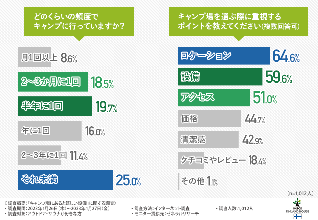 そこで今回、デザイナーズログハウスを手掛ける株式会社ビックボックス(https://www.fin-bigbox.com)は、アウトドア・サウナが好きな方を対象に、「キャンプ場にあると嬉しい設備」に関する調査を行いました。