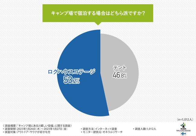 「キャンプ場で宿泊する場合はどちら派ですか?」と質問したところ、『テント(46.8%)』『ログハウスコテージ(53.2%)』という回答結果になりました。