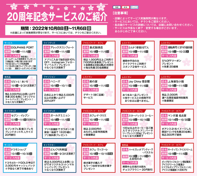 ・オアシス21店舗にて20周年記念サービスを展開!