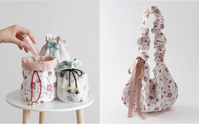 ギャザーやドレープを活かしたポーチやバッグ。シンプルな柄なのでコードやリボンの色をアクセントに。